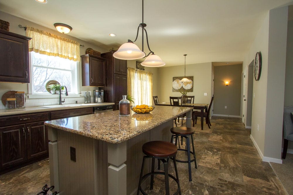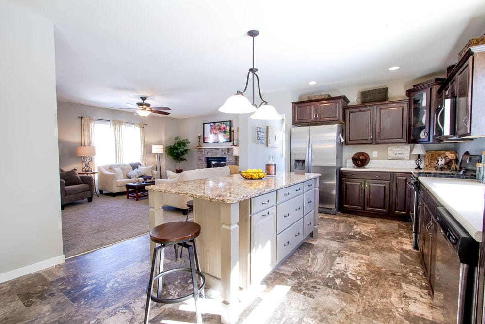 Explore the Ridgefield modular home through our detailed photo gallery, featuring an expansive open-concept living area, a modern kitchen with a large social island, and bright, airy interiors. This popular Ranch floor plan combines the effortless convenience of single-story living with high-end finishes and a thoughtful, modern layout.